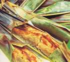 Spoon a portion of the mixture onto a coconut leave (open it up slightly).
